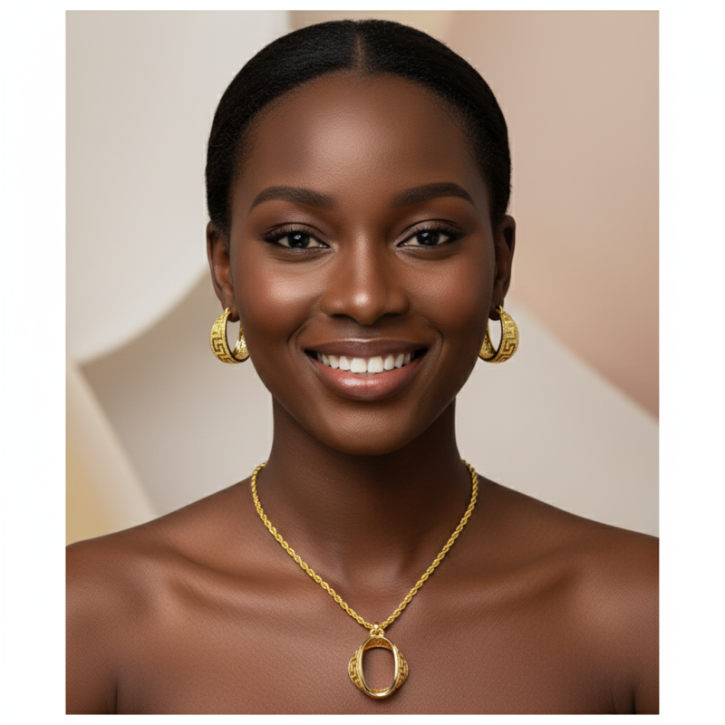 L’ensemble "Daba Thiam" en plaqué or est une véritable célébration de la féminité et du style sophistiqué. Composé de pièces assorties (collier, boucles d’oreilles, bracelet, bague — selon la composition), il se distingue par son design raffiné, inspiré à la fois du chic moderne et de l’élégance culturelle.