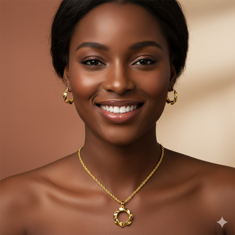 L'ensemble "Daba Thiam" en plaqué or est une célébration de la féminité véritable et du style sophistiqué. Composé de pièces assorties (collier, boucles d'oreilles, bracelet, bague — selon la composition), il se distingue par son design raffiné, inspiré à la fois du chic moderne et de l'élégance culturelle .